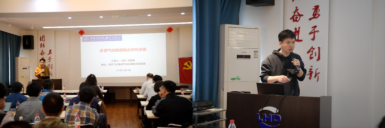 会上,LHD青年科研代表洪启臻和刘洋首先分别作了“多源气动数据融合研究进展”报告。洪启臻介绍了高温流动多层级(微观+宏观)流场重构方面的研究工作,在神经网络训练中,通过深度神经算子加入物理约束,利用稀疏测量数据反演得到全流场物理量。刘洋介绍了关于流形表征融合的多源异构气动数据代理建模方面的研究进展,通过引入物理信息,减少对样本的依赖,提升了模型精度,获得了更多信息和可解释性,有效融合多源异构数据,实现了快速气动设计。