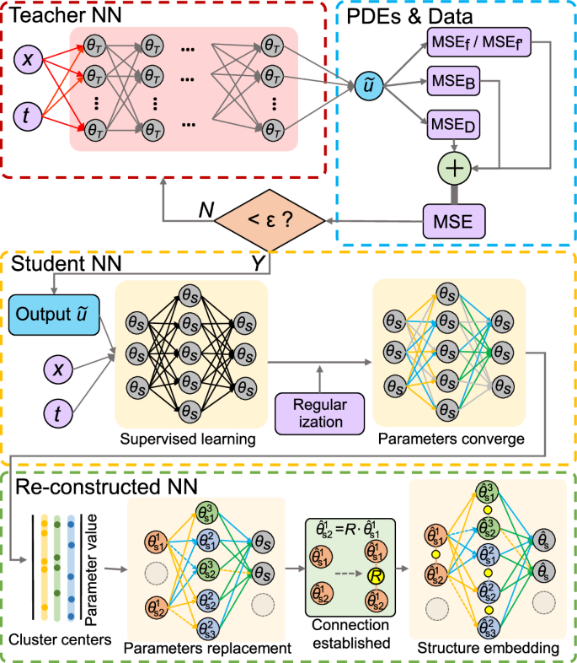 近期,实验室与清华大学联合研究团队在国际顶级期刊《自然·通讯》(Nature Communications)上发表了题为“Automatic network structure discovery of physics informed neural networks via knowledge distillation”的研究成果。该研究提出了一种全新的物理信息嵌入方法——物理结构嵌入神经网络(Physics Structure Informed Neural Networks,Ψ-NN),通过知识蒸馏机制实现了物理信息神经网络(PINN)结构的自动识别与重构,显著提升了模型在复杂系统建模中的精度、效率与可解释性。