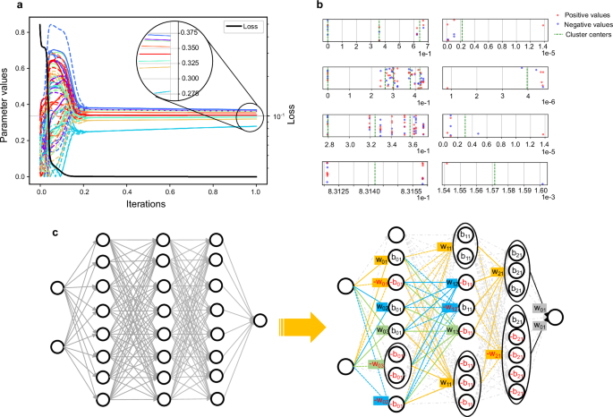 研究团队发现,特定的物理性质(如流动的对称性、守恒性)可等效映射到神经网络的权重结构中,例如,通过群等变理论可证明,流动的对称性在神经网络中对应于具有对称参数约束或权重共享的结构形式,二者在数学意义上具有一致性。为此,研究团队提出了Ψ-NN框架,将知识蒸馏思想引入物理信息学习,构建“教师-学生”双网络协同优化机制自动提取具有物理意义的神经网络权重结构特征。该框架包含三个核心阶段:(1)物理信息蒸馏:教师网络采用标准PINN学习物理场,学生网络在其输出监督下训练,实现物理知识的高效迁移;(2)通过L2正则化与聚类分析,自动识别学生网络中具有物理意义的网络权重聚类结构,揭示权重共享、对称性等内在组织规律;(3)结构化网络重构:将提取的聚类结构重构为具备明确物理性质的神经网络,实现参数压缩、结构固化与可解释性增强。