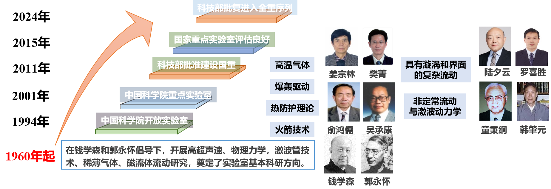 空天飞行高温气动全国重点实验室(State Key Laboratory of High Temperature Gas Dynamics, LHD)聚焦国家空天自由进出能力提升需求,致力打造空天飞行科技原始创新策源地和人才高地。实验室以二十世纪五十年代末钱学森和郭永怀先生创立的中国科学院力学研究所气动科研团队为基础,逐渐发展成为学科特色鲜明、研究方向明确的一支国家战略科技力量。实验室坚持钱学森先生倡导的“工程科学”理念,以创新求发展,逐步形成了理论、实验和数值模拟相结合,装备配套齐全,具有国际影响力的高温气体动力学开放研究基地。2011年10月,由科技部批准成为国家重点实验室。2022年6月,依托中国科学院力学研究所建设,中国科学技术大学参与共建,进入中国科学院首批重组国家重点实验室序列。2024年12月,通过科技部评审正式进入全重序列,进入加快建设发展的新阶段。现任实验室主任为黄河激研究员,学术委员会名誉主任为俞鸿儒院士,学术委员会主任为唐志共院士。